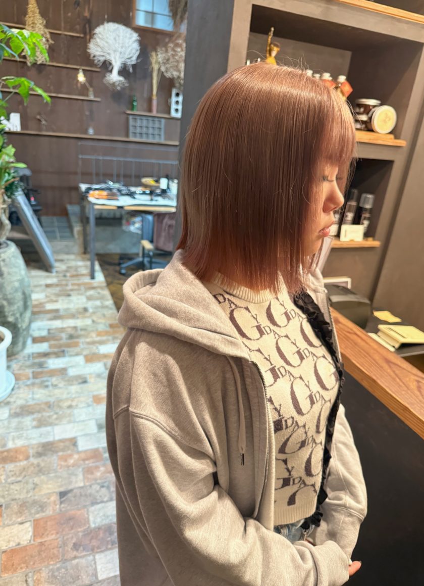 ケアブリーチでブリーチ後、オンカラーで赤みを抑えたナチュラルな透明感のあるボブに。