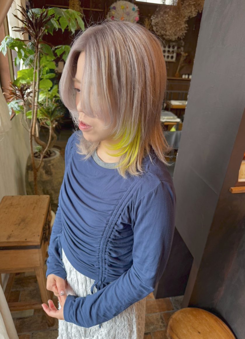 レイヤーで顔まわりに動きをつけて、インナーにライムカラーでアクセントを。